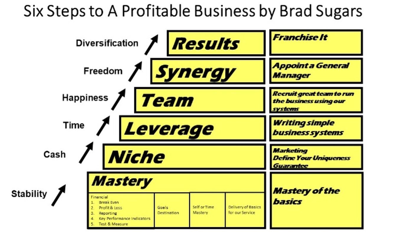 The below diagram describes a system which is called Six Steps To A Profitable Business.